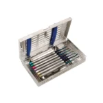 Fine micro serrations designed to loosen tooth from the socket and periodontal ligaments. Surgical stainless steel coated with blue titanium for extra strength and durability during extraction. This complete kit is easy to clean and easy to use in a variety of dental surgery procedures. Includes: